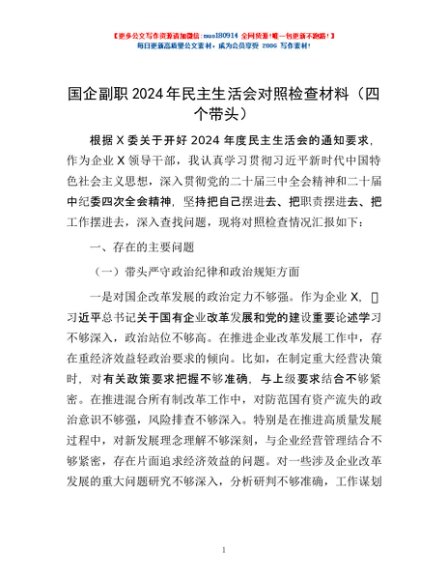 / 国企副职2024年民主生活会对照检查材料(四个带头)