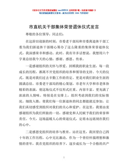 / 市直机关干部集体荣誉退休仪式发言