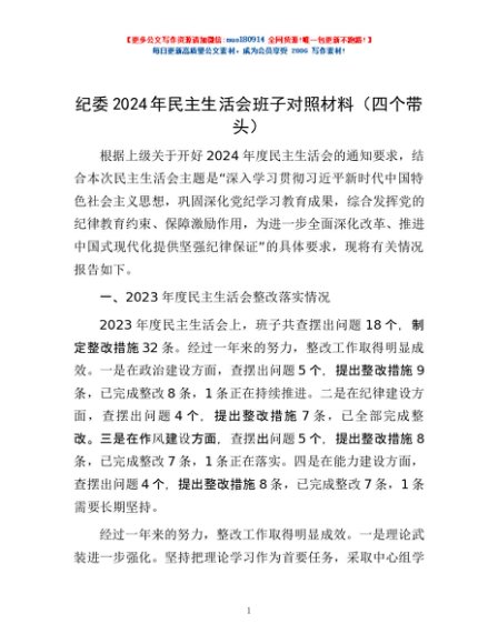 / 纪委2024年民主生活会班子对照材料(四个带头)
