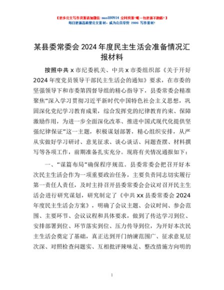 / 某县委常委会2024年度民主生活会准备情况汇报材料