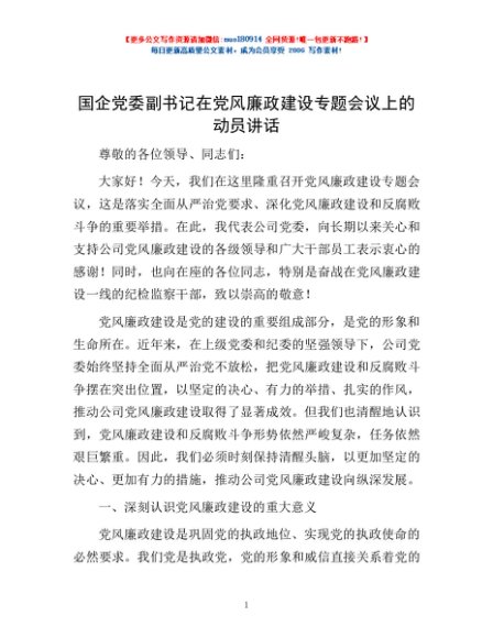 / 国企党委副书记在党风廉政建设专题会议上的动员讲话
