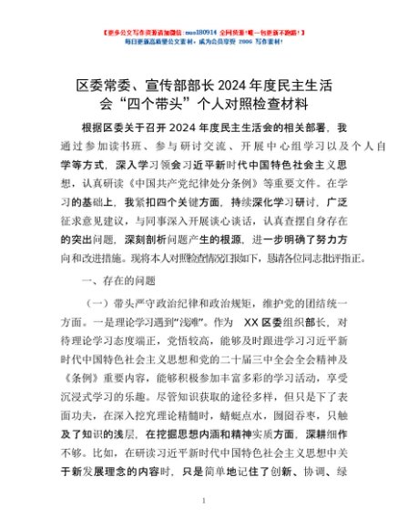 / 区委常委、宣传部部长2024年度民主生活会“四个带头”个人对照检查材料