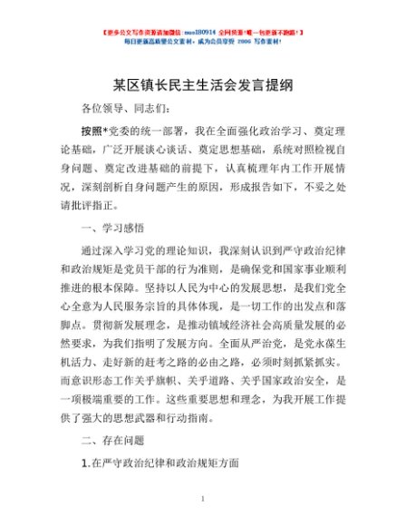 / 某区镇长民主生活会发言提纲