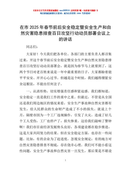 / 在市2025年春节前后安全稳定暨安全生产和自然灾害隐患排查百日攻坚行动动员部署会议上的讲话