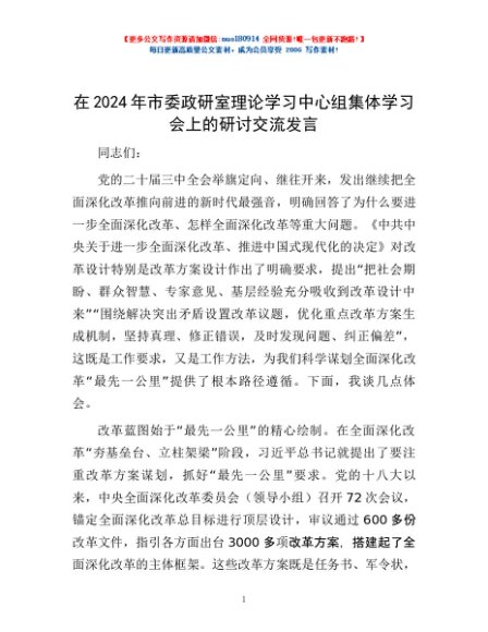 / 在2024年市委政研室理论学习中心组集体学习会上的研讨交流发言