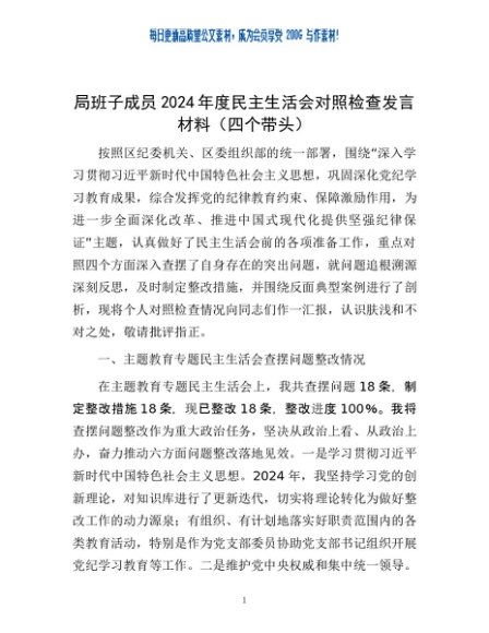 / 局班子成员2024年度民主生活会对照检查发言材料(四个带头)