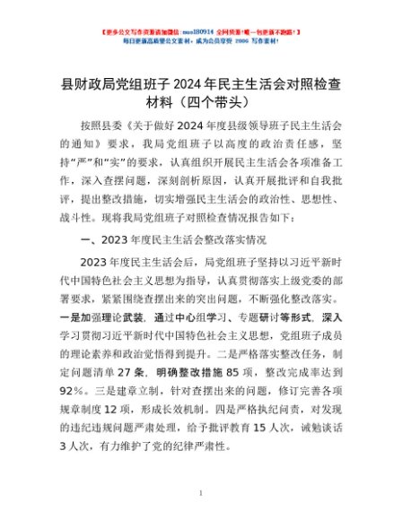 / 县财政局党组班子2024年民主生活会对照检查材料(四个带头)