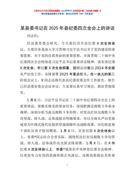 / 某县委书记在2025年县纪委四次全会上的讲话