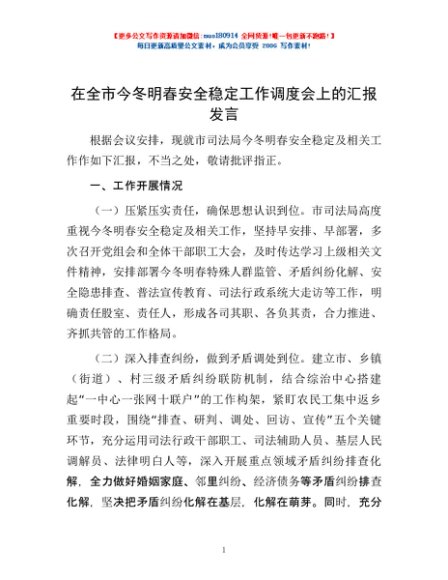 / 在全市今冬明春安全稳定工作调度会上的汇报发言