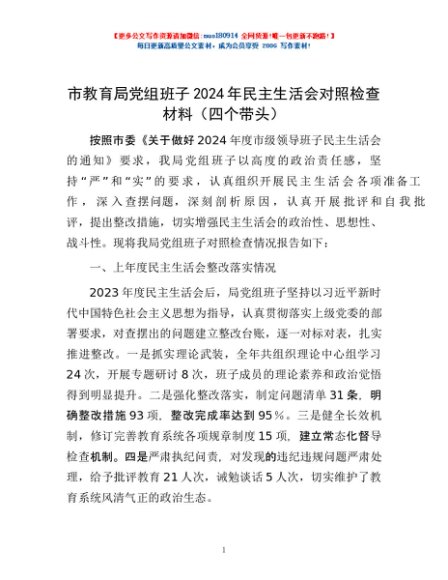 / 市教育局党组班子2024年民主生活会对照检查材料(四个带头)