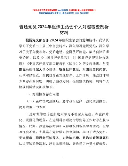 / 普通党员2024年组织生活会个人对照检查剖析材料