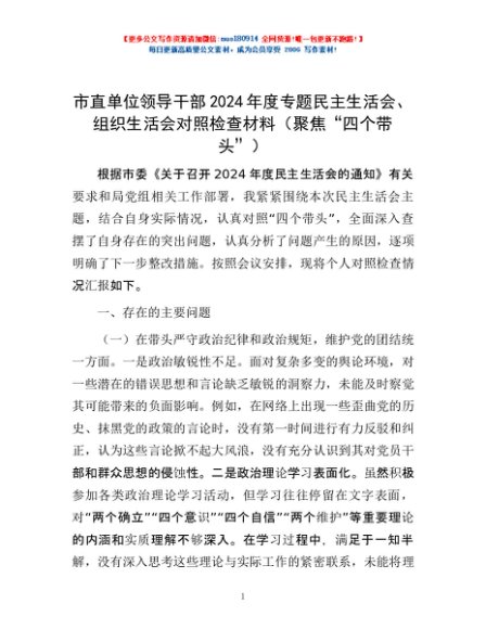 / 市直单位领导干部2024年度专题民主生活会、组织生活会对照检查材料(聚焦“四个带头”)
