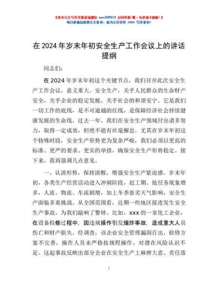 / 在2024年岁末年初安全生产工作会议上的讲话提纲