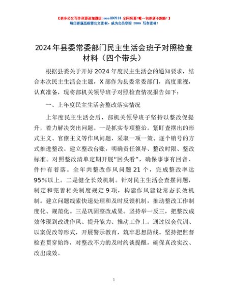 / 2024年县委常委部门民主生活会班子对照检查材料(四个带头)