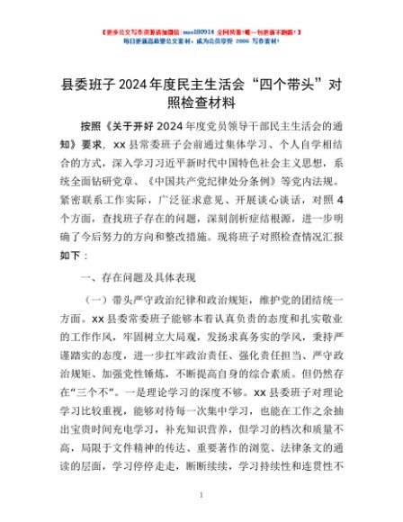 / 县委班子2024年度民主生活会“四个带头”对照检查材料