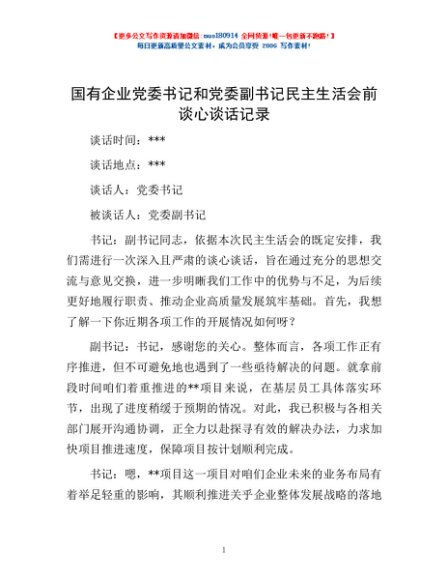 / 国有企业党委书记和党委副书记民主生活会前谈心谈话记录
