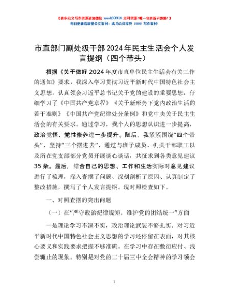 / 市直部门副处级干部2024年民主生活会个人发言提纲(四个带头)