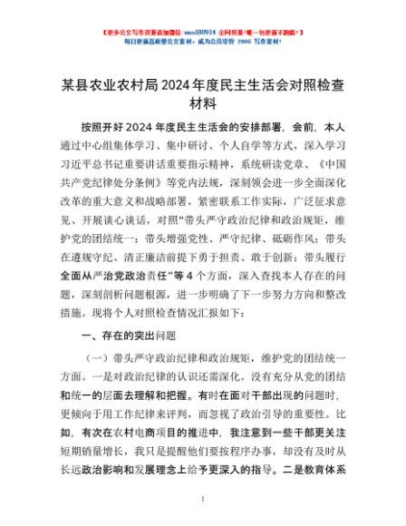 / 某县农业农村局2024年度民主生活会对照检查材料