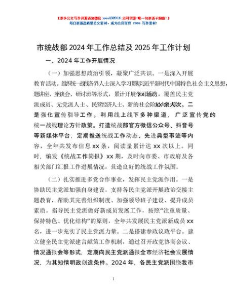 / 市统战部2024年工作总结及2025年工作计划
