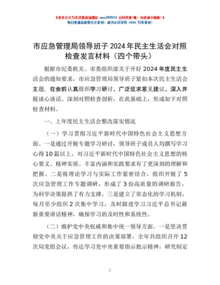 / 市应急管理局领导班子2024年民主生活会对照检查发言材料(四个带头)