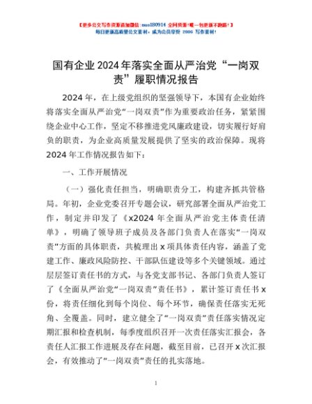 / 国有企业2024年落实全面从严治党“一岗双责”履职情况报告