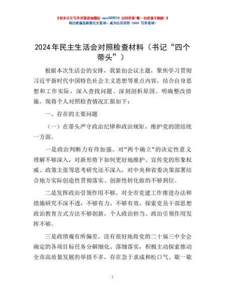 / 2024年民主生活会对照检查材料(书记“四个带头”)