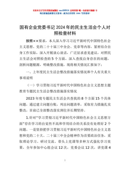 / 国有企业党委书记2024年的民主生活会个人对照检查材料
