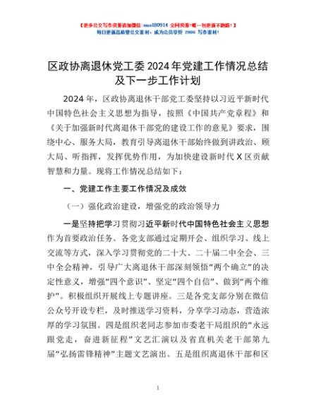 / 区政协离退休党工委2024年党建工作情况总结及下一步工作计划