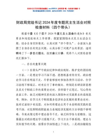 / 财政局党组书记2024年度专题民主生活会对照检查材料(四个带头)