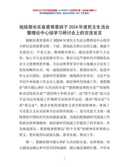 / 统战部长在县委常委班子2024年度民主生活会暨理论中心组学习研讨会上的交流发言