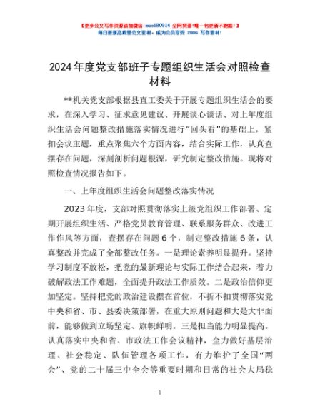 / 2024年度党支部班子专题组织生活会对照检查材料