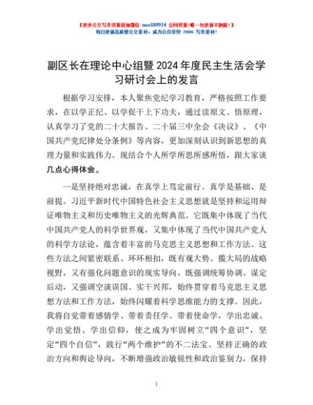 / 副区长在理论中心组暨2024年度民主生活会学习研讨会上的发言