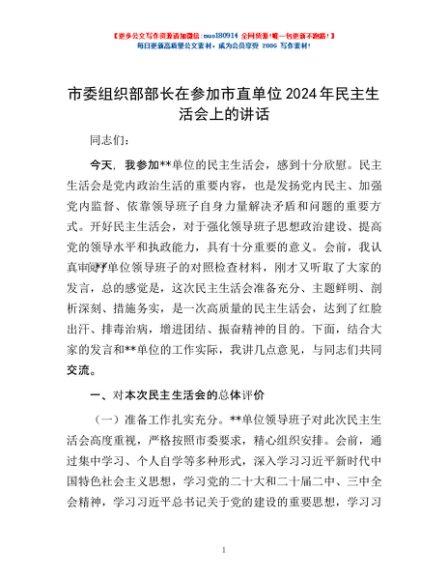 / 市委组织部部长在参加市直单位2024年民主生活会上的讲话
