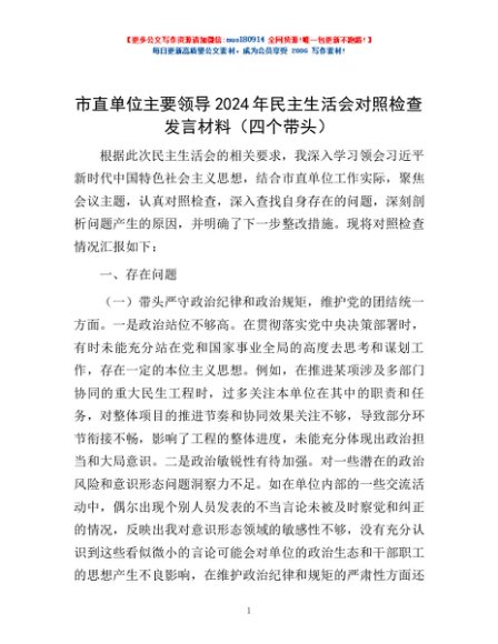 / 市直单位主要领导2024年民主生活会对照检查发言材料(四个带头)
