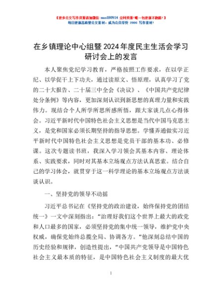 / 在乡镇理论中心组暨2024年度民主生活会学习研讨会上的发言