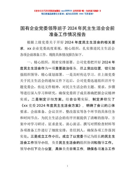 / 国有企业党委领导班子2024年民主生活会会前准备工作情况报告