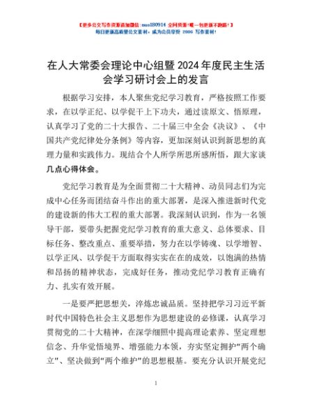 / 在人大常委会理论中心组暨2024年度民主生活会学习研讨会上的发言