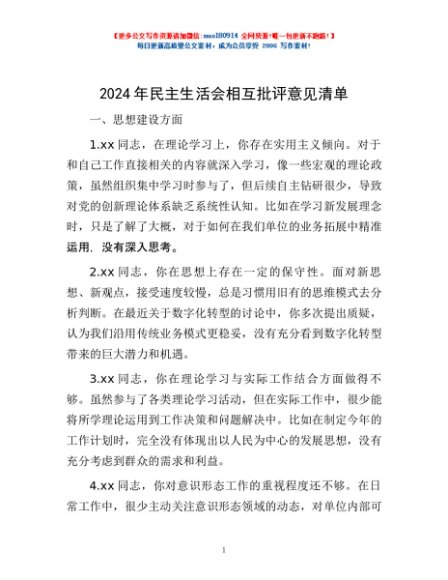 / 2024年民主生活会相互批评意见清单