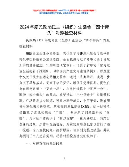 / 2024年度民政局民主(组织)生活会“四个带头”对照检查材料