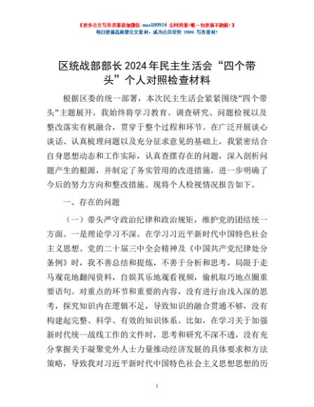 / 区统战部部长2024年民主生活会“四个带头”个人对照检查材料