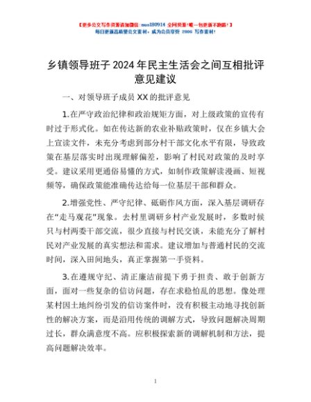 / 乡镇领导班子2024年民主生活会之间互相批评意见建议
