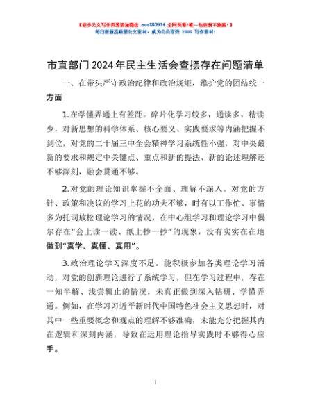 / 市直部门2024年民主生活会查摆存在问题清单