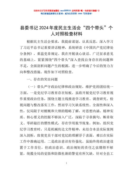 / 县委书记2024年度民主生活会“四个带头”个人对照检查材料