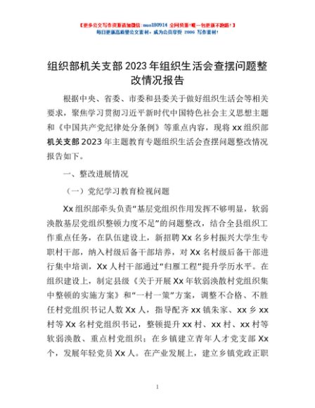 / 组织部机关支部2023年组织生活会查摆问题整改情况报告