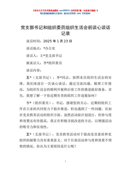 党支部书记和组织委员组织生活会前谈心谈话记录