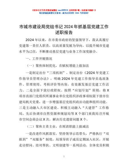/ 市城市建设局党组书记2024年抓基层党建工作述职报告