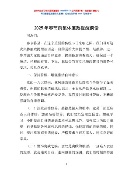 2025年春节前集体廉政提醒谈话