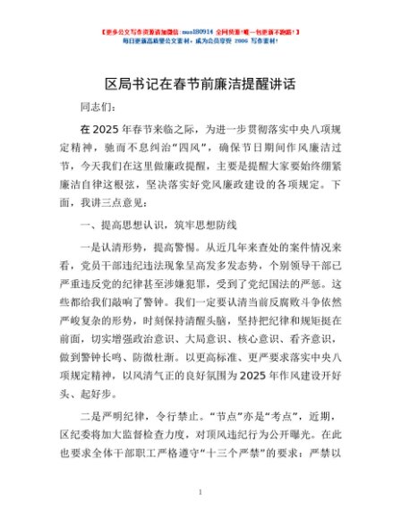 / 区局书记在春节前廉洁提醒讲话