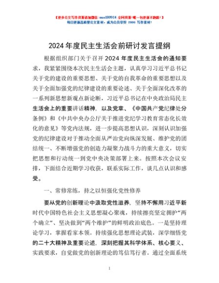 / 2024年度民主生活会前研讨发言提纲