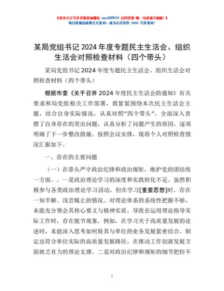 / 某局党组书记2024年度专题民主生活会、组织生活会对照检查材料(四个带头)